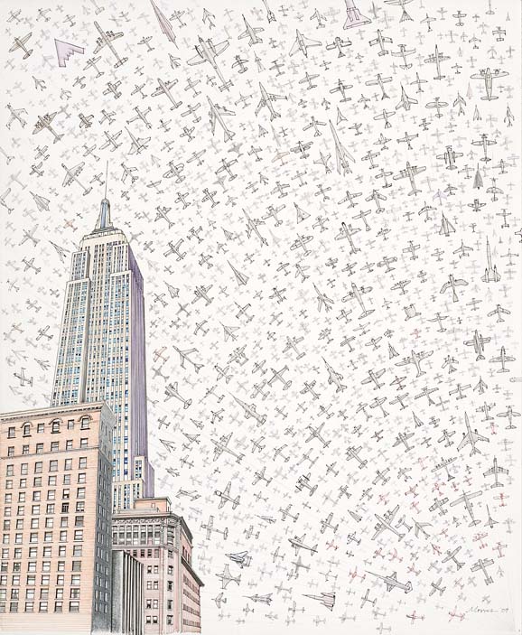 Usually I start with a building that gets my attention, and I take it from there. With the sort of drawings that I do, it is almost impossible to correct a mistake or reverse a wrong direction, so a bit of time and brooding goes into it. If I were a photographer it would be called a photo-montage. Each original drawing is done with micro-pens of various diameters and points, on archival drawing paper. - Robert Morris