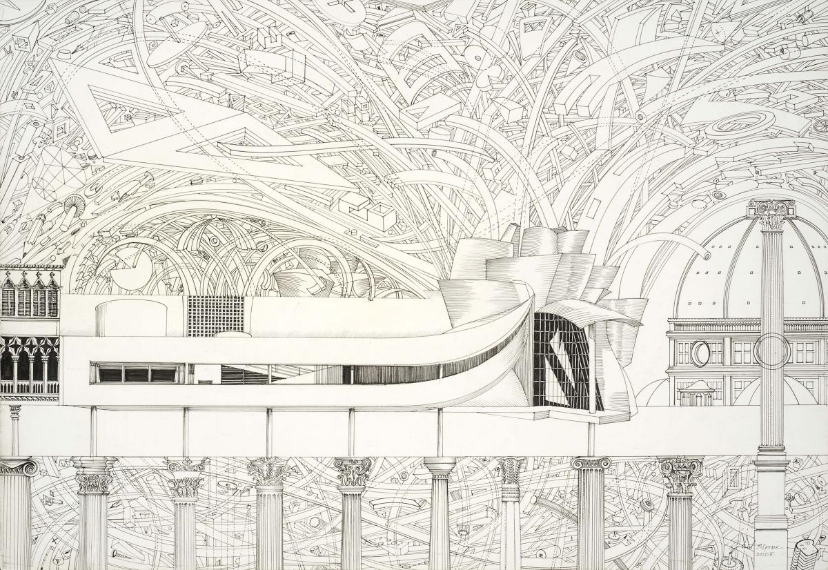 This is an amalgamation of architecture with anarchy at the top and bottom and stability in between. Sort of a duel between something geometric and under control and other things that are totally out of control - which is what you find in architecture. available with frame